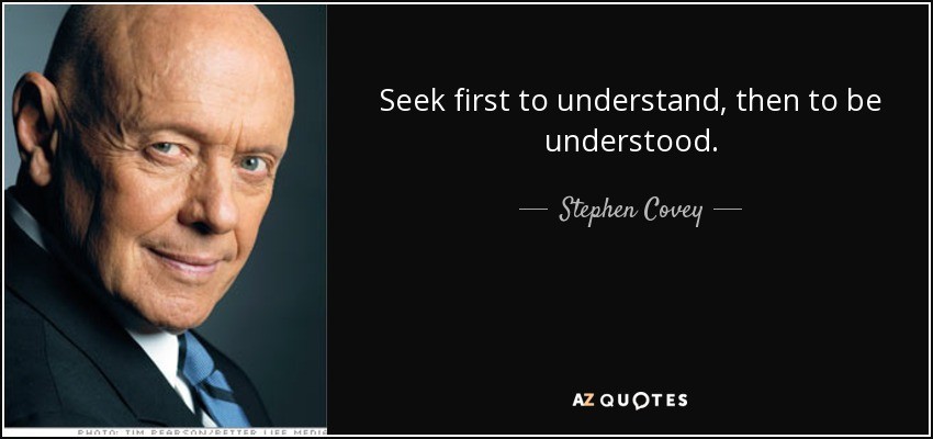 We started unpacking the situation by reflecting on the need to understand and adapt to other peoples working and leadership styles to find common ground and achieve consensus. We talked about the need to understand before being understood, taking inspiration from Steve Coveys quote below.